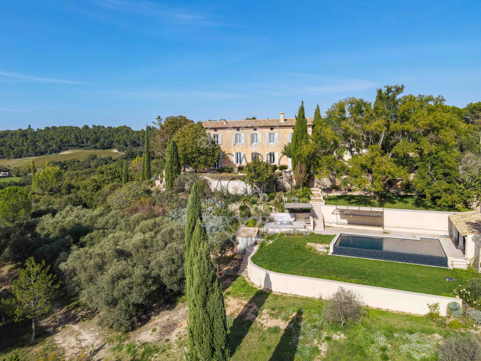 La bastide d'env. 400m2, est posée sur une grande esplanade ombragée par de beaux arbres et sublimée par une vue panoramique, avec aux alentours une nature préservée, une centaine d'oliviers et des bois. Elle comprend: entrée vestibule, salle à manger avec cheminée, salon bibliothèque, grand salon avec cheminée prolongé par une orangerie avec cuisine d'été, une cuisine avec son office, une buanderie et cave à vin. A l’étage, un bureau, une pièce de rangement-dressing, une salle d'eau et des toilettes séparés ainsi que 5 chambres dont une suite avec son dressing, ses toilettes, sa salle de bain avec baignoire et douche et son bureau. Sous le toit, un grand grenier. La maison de gardien d’environ 100m2 dispose de 4 chambres, d'un salon avec cheminée, d'une cuisine et d'une salle d’eau.