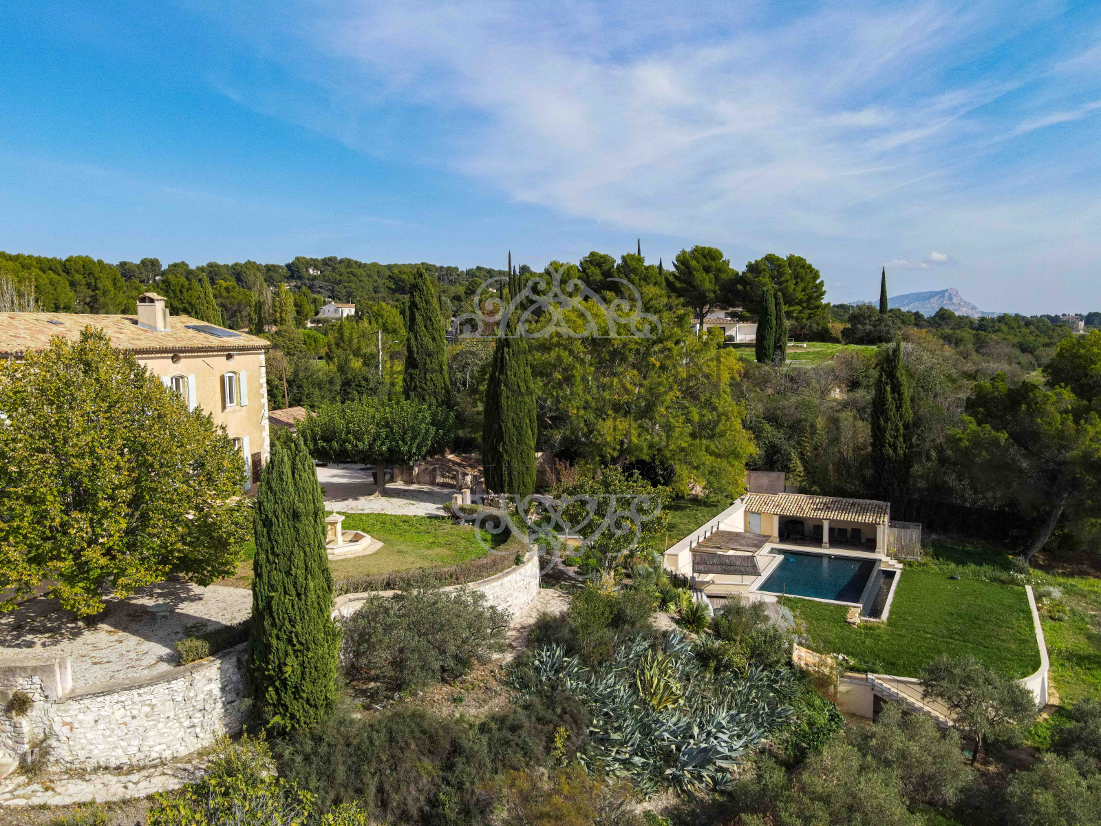Proprieté de 2,6 hectares comprenant une bastide ancienne et une maison de gardiens, avec une vue panoramique dominant la campagne et la ville d'AIX en PROVENCE.