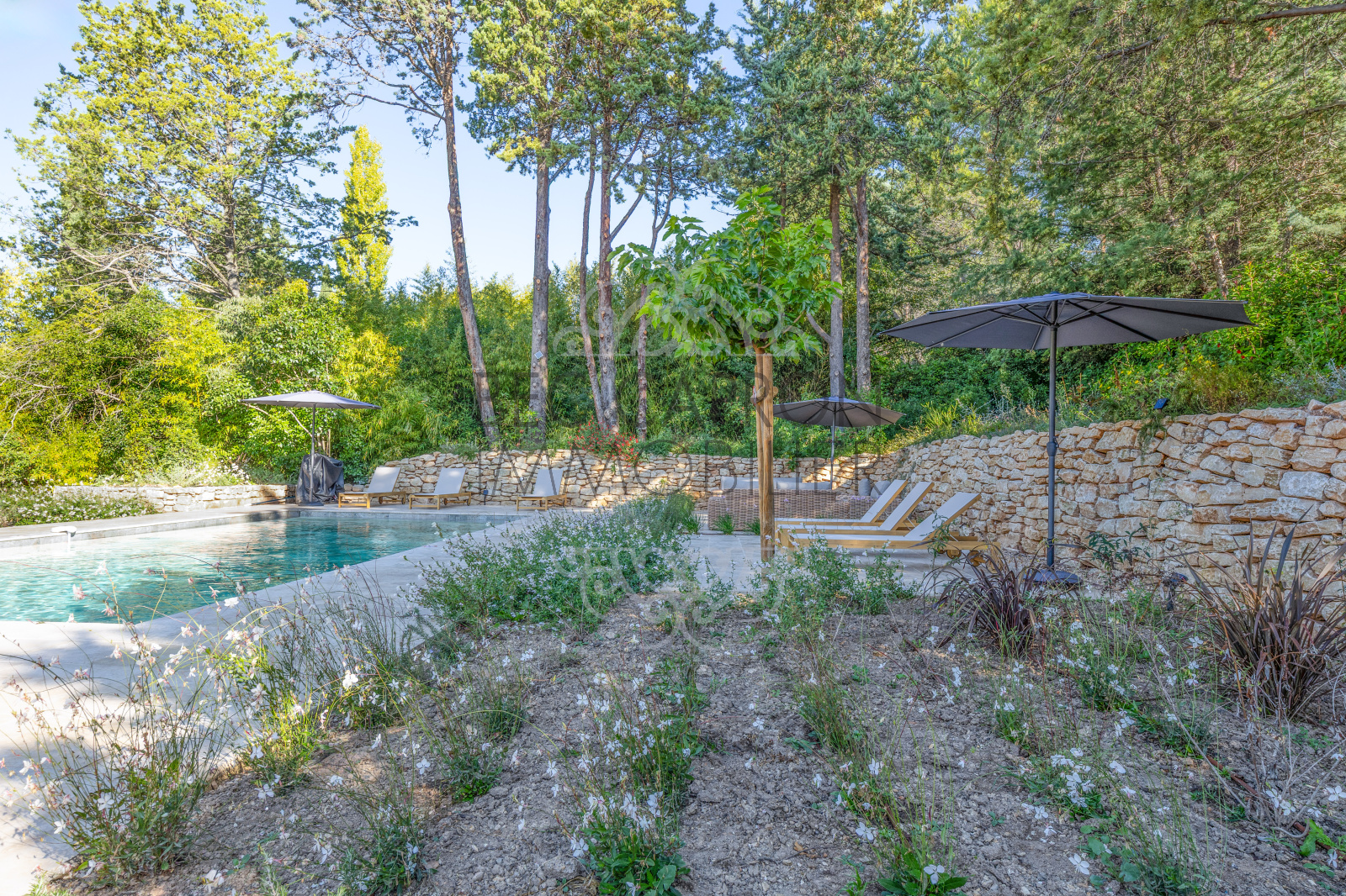 À l’extérieur, une piscine de 10 x 5 s’intègre dans un environnement naturel préservé, où le calme et la verdure renforcent l’esprit de sérénité du lieu.